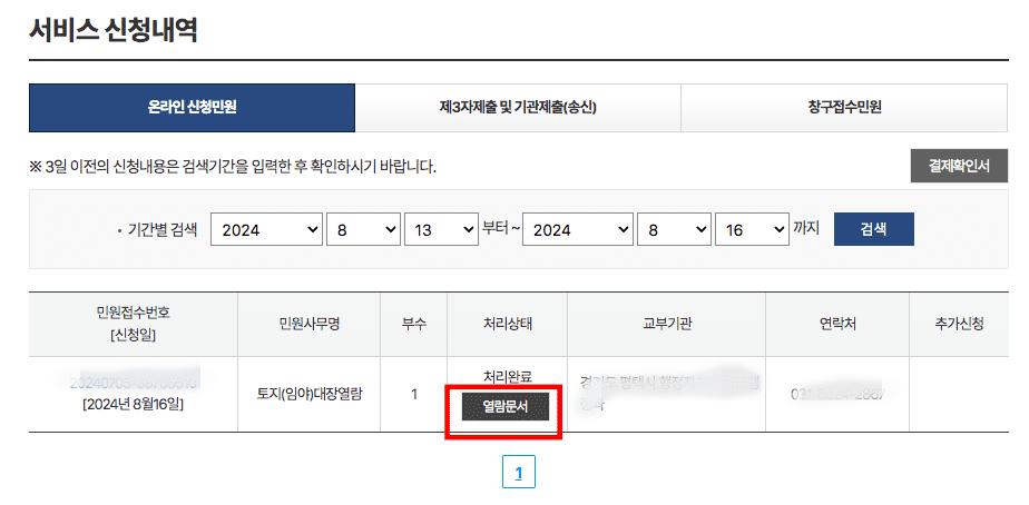 연혁 인쇄 유무, 폐쇄대장구분, 특정 소유자 유무 선택 후 공시지가 기준 년도, 소유자 주민등록번호 뒷자리 표시, 수령방법을 선택하시고 하단의 신청하기 버튼을 터치하면 민원 신청내역에서 토지대장을 열람할 수 있으니 직접 확인해 보시기 바랍니다.