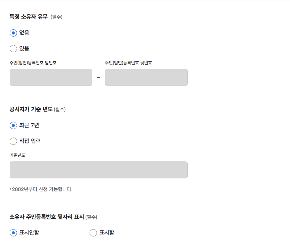 신청내용 대상 토지 소재지 입력을 위해 우측의 검색 버튼을 클릭하여 지번 주소를 찾습니다. 이후 하단에 상세 주소를 입력합니다. 연혁이나 특정소유자 유무 등의 내용은 그대로 두어도 괜찮습니다. 이후 우측 하단의 신청하기 버튼을 클릭하시면 토지대장 무료열람 신청이 완료됩니다.