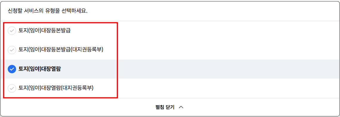토지대장 등본 발급 및 열람 페이지가 표시되면 다른 유형 선택도 가능합니다. [다른 유형 펼쳐보기]를 클릭하면 다른 서비스 유형으로 전환이 가능하니 참고하시기 바랍니다.