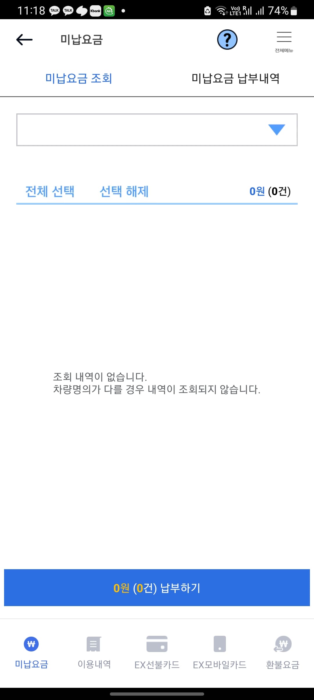 고속도료 통행료 앱에 대표차량을 등록하시고 미납통행료 조회 납부 버튼을 터치하면 미납된 통행료가 조회됩니다. 미납요금이 조회된다면 하단의 납부하기 버튼을 터치하여 납부하시면 됩니다.