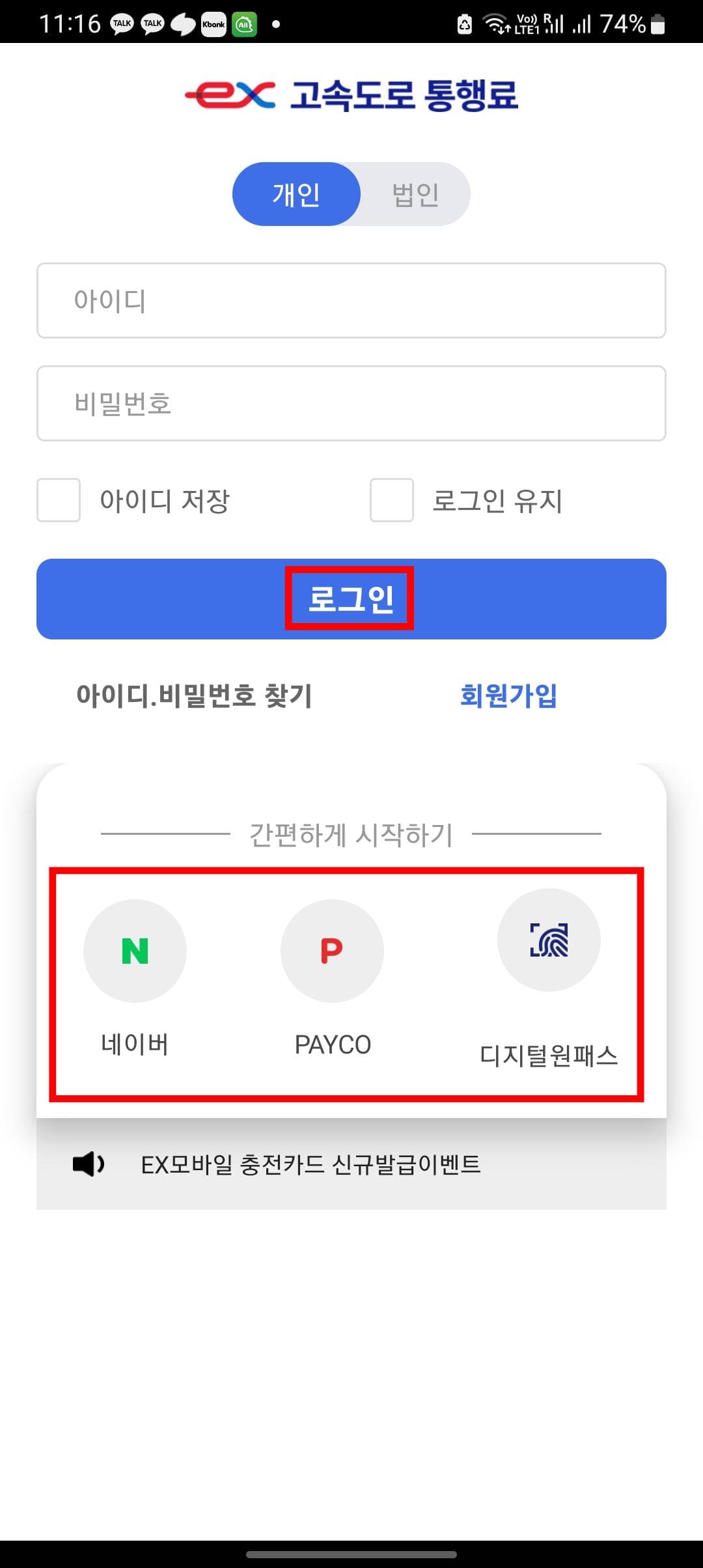 고속도로 통행료 앱을 실행하시면 위와 같은 로그인 화면을 볼 수 있습니다. 회원가입을 하셨다면 아이디와 비밀번호를 입력하고 하단의 로그인 버튼을 터치합니다. 만약 회원가입을 하지 않았다면 로그인 버튼 아래 네이버, 페이코, 디지털 원패스를 터치하여 간편하게 시작할 수 있습니다.
