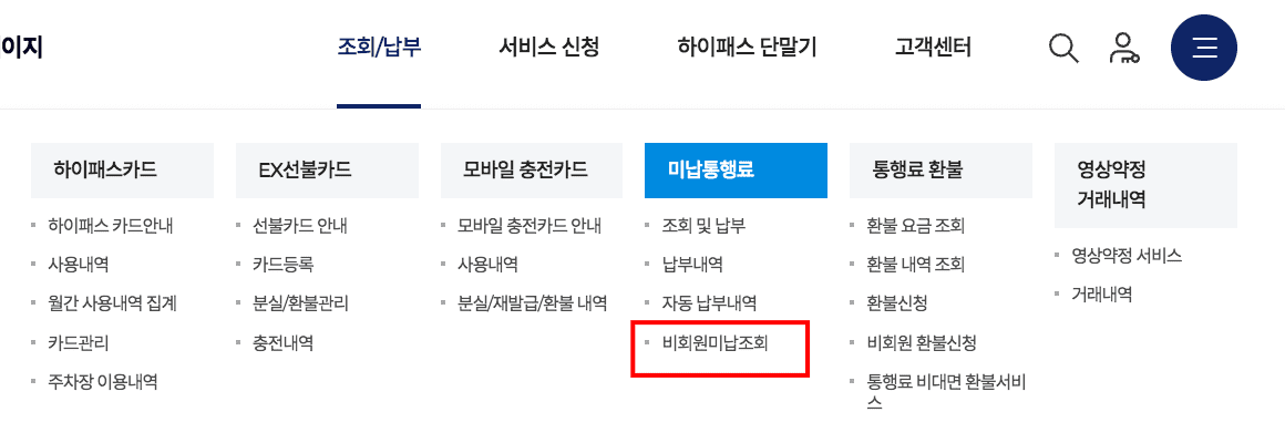 고속도로 통행료 홈페이지에 방문하시면 위와 같은 메인 화면을 볼 수 있습니다. 상단 메인 메뉴에서 조회/납부로 마우스를 가져갑니다. 미납통행료 > 비회원미납조회를 선택합니다.