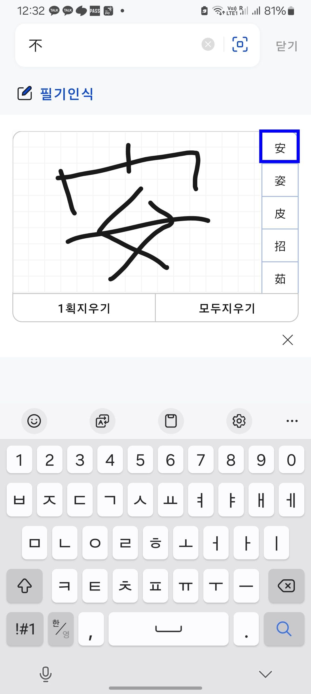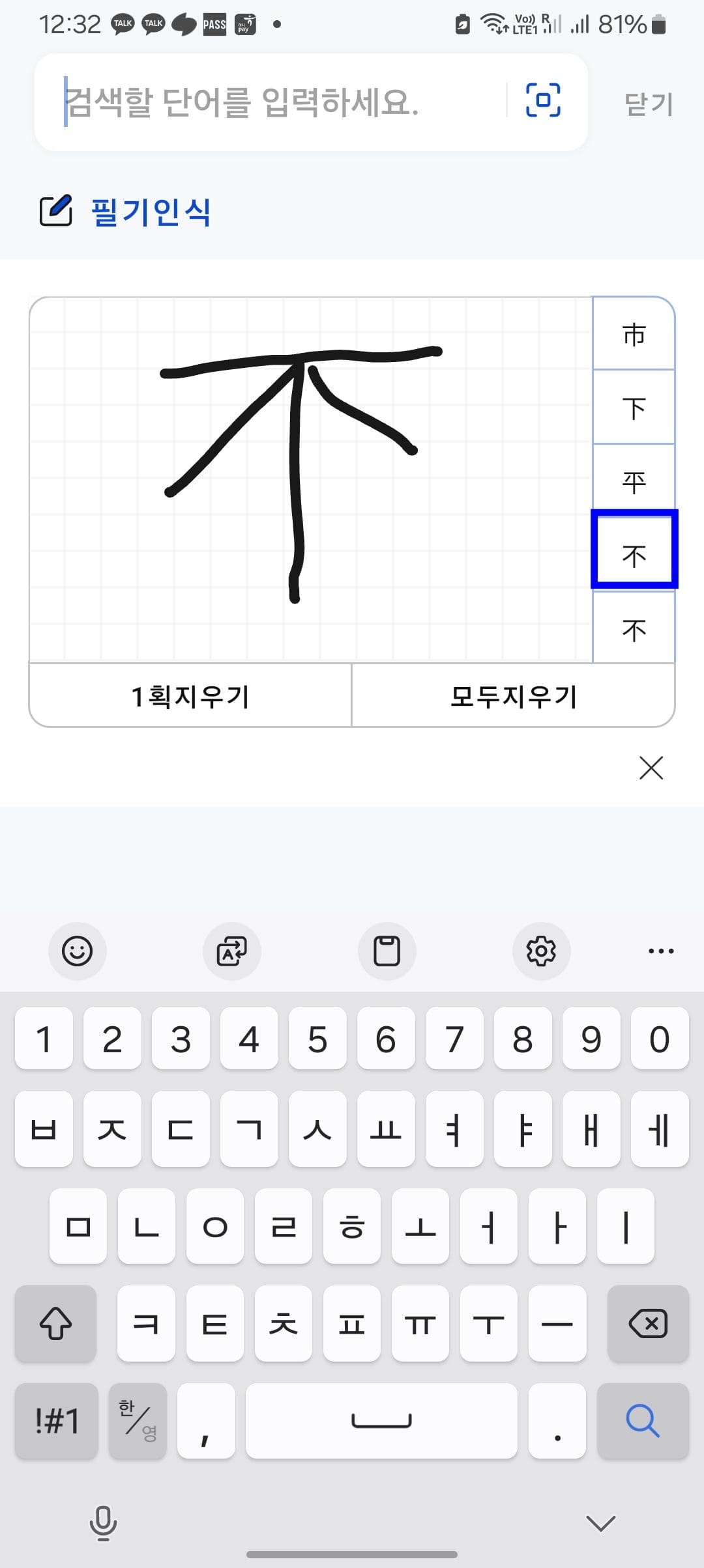 필기인식 창이 표시되면 직사각형 안에 한자를 그려줍니다. 틀리더라도 하단의 1획 지우기, 모두 지우기를 터치하여 다시 그릴 수 있습니다. 한자를 그리게 되면 좌측에 유사한 한자 5개가 표시됩니다. 가장 유사한 한자를 선택합니다. 검색창에 해당 한자가 입력되었으면 우측 하단의 돋보기 아이콘을 터치합니다.