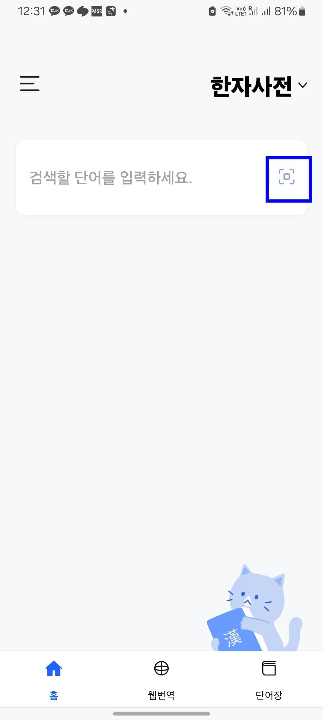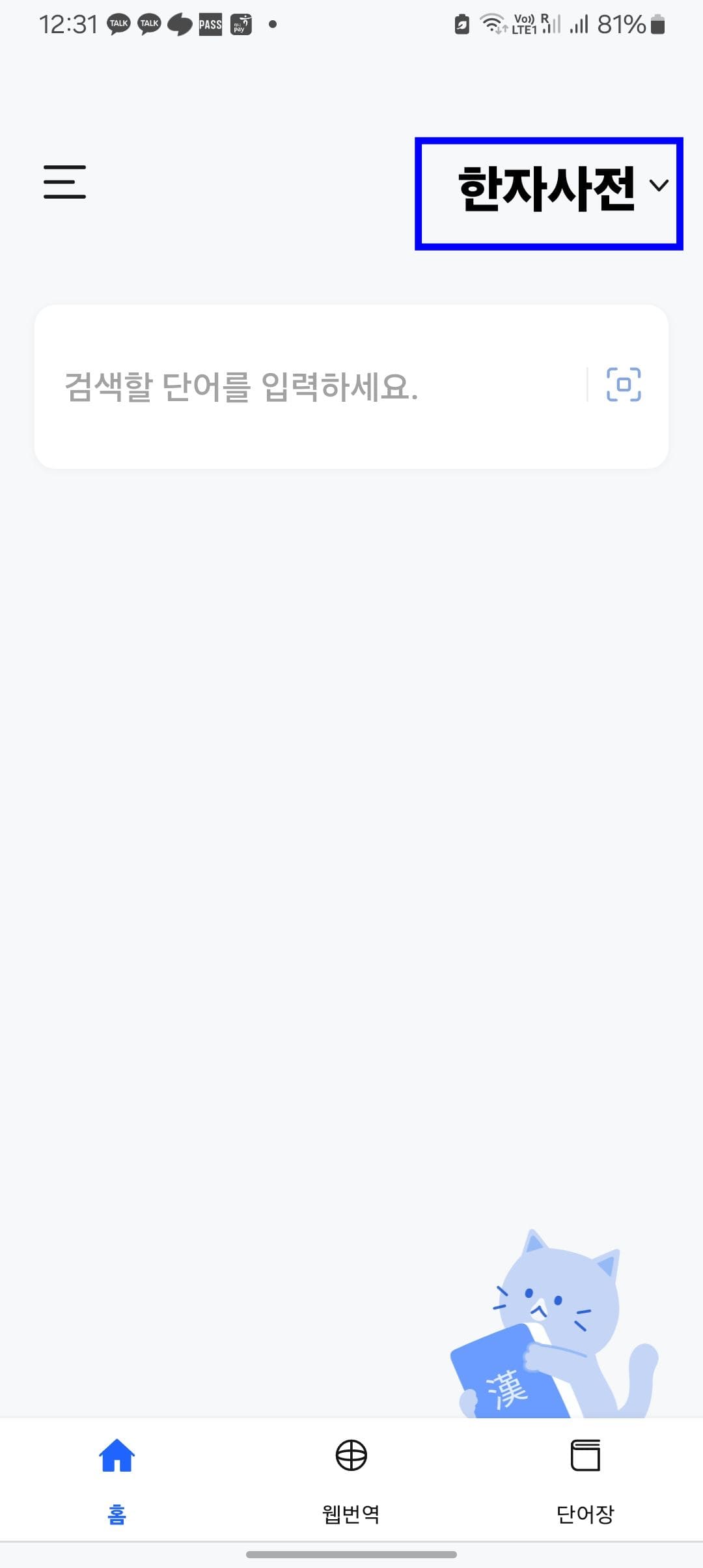 다음 사전 앱을 설치하고 실행하시면 위와 같은 첫화면을 보게 됩니다. 만약 우측 상단이 다른 언어 사전으로 되어있다면 클릭하여 한자사전으로 변경하시기 바랍니다. 한자사전으로 변경되었다면 검색창 우측의 아이콘을 터치합니다.