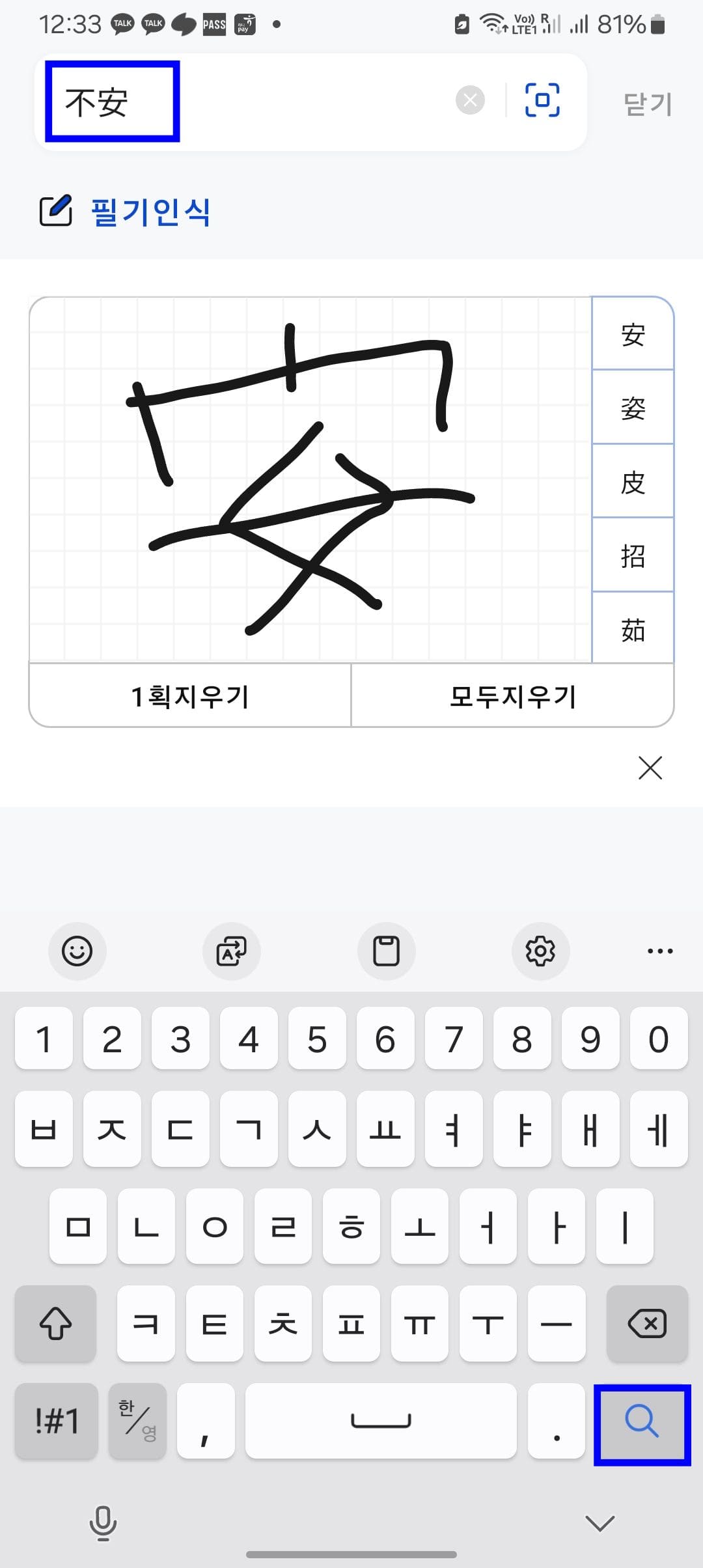 필기인식 창이 표시되면 방금 전에 본 한자를 써보고 유사한 한자를 좌측에서 터치합니다. 검색창에 모든 한자가 입력되었다면 우측 하단의 돋보기 아이콘을 터치합니다. 검색결과를 확인하시면 불안이라는 한자는 아니 불, 편안할 안이 사용된 것을 확인할 수 있습니다.