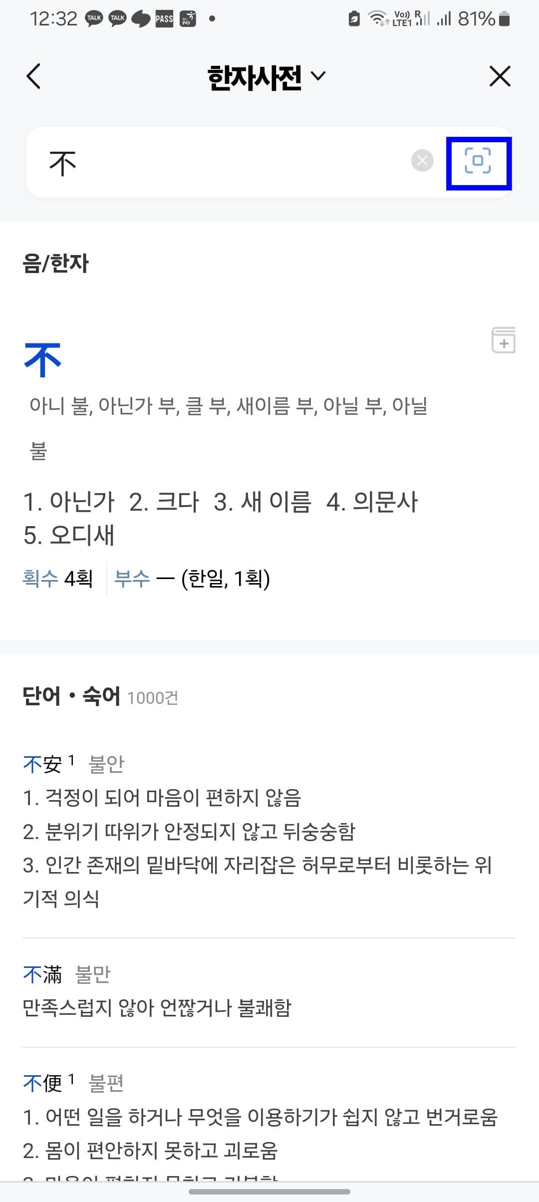 검색결과를 확인하니 해당한자는 아니 불이라는 것을 알게되었습니다. 하단에서 검색결과 더 보기를 터치합니다. 단어 중에 써보기 원하는 단어를 선택합니다. 이후 상단 검색창 우측의 아이콘을 다시 한번 터치합니다.