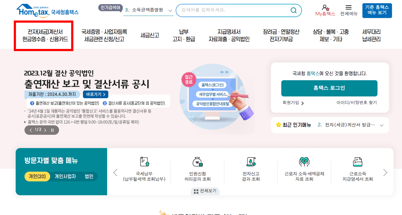 현금영수증을 국세청 홈택스 홈페이지에서 조회하려면 아래의 링크를 통해 홈택스에 방문하시기 바랍니다.