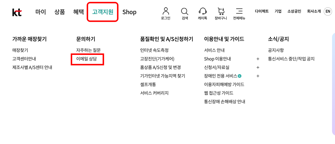 kt 고객센터 전화번호를 통한 문의 이외에도 이메일 접수를 통한 문제 해결이 가능합니다. 먼저 kt 홈페이지에 방문합니다. 이메일 상담을 신청하기 위해서는 로그인이 필요하므로 먼저 로그인을 진행하시기 바랍니다.